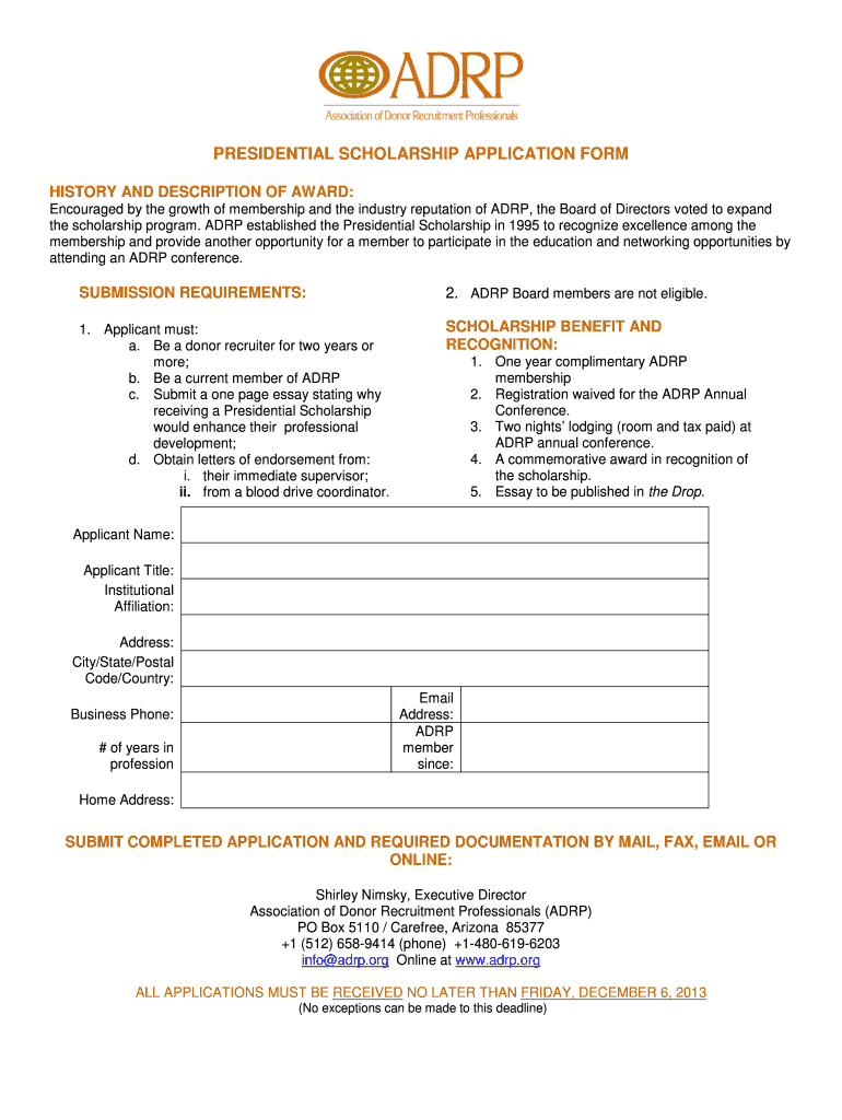 Get the free Presidential scholarship bapplicationb form - Association of Donor bb - adrp