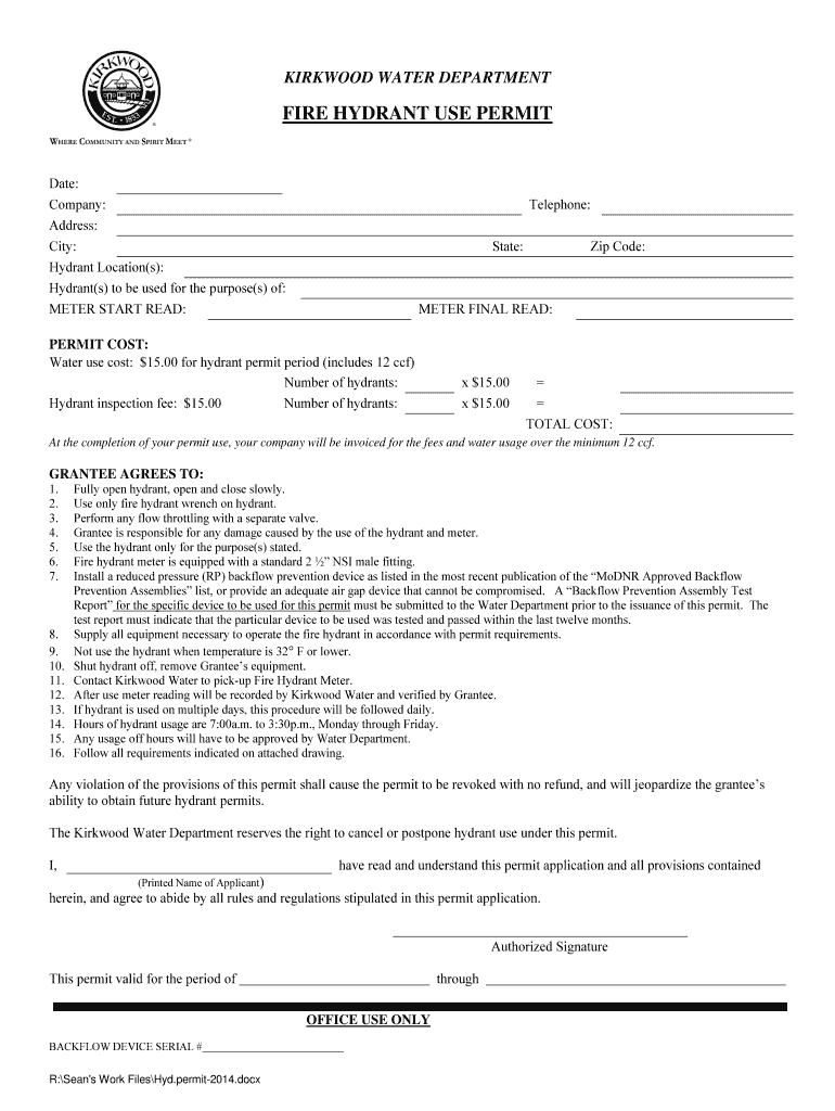Get the free FIRE HYDRANT USE PERMIT - Kirkwood - kirkwoodmo