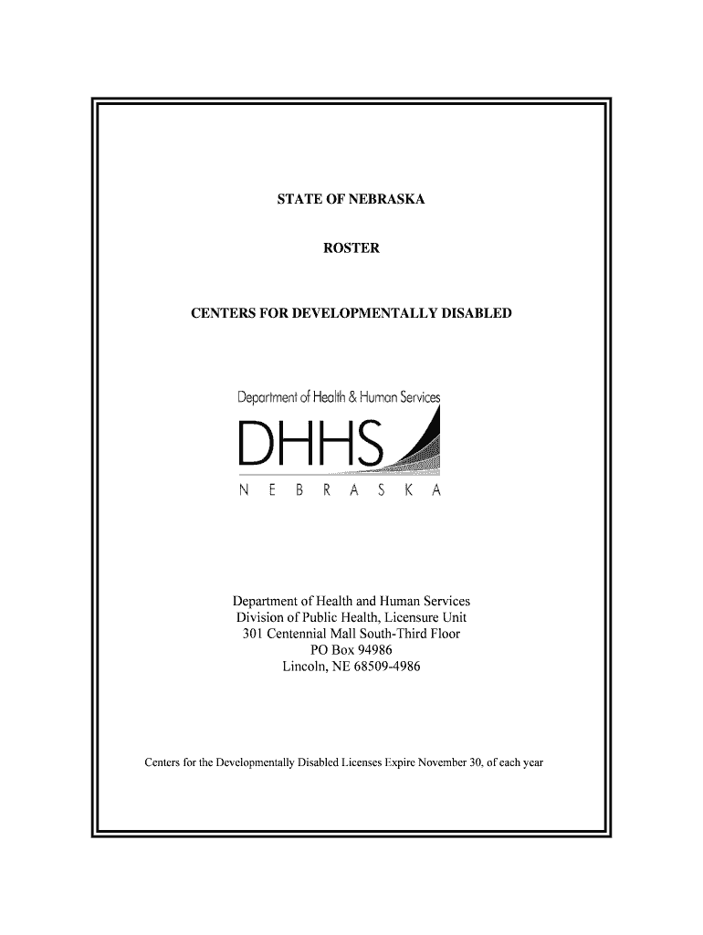 STATE OF NEBRASKA ROSTER CENTERS FOR DEVELOPMENTALLY DISABLED Department of Health and Human Services Division of Public Health, Licensure Unit 301 Centennial Mall South-Third Floor PO Box 94986 Lincoln,