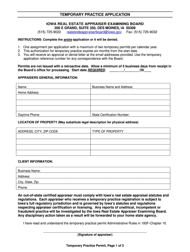 TEMPORARY PRACTICE APPLICATION IOWA REAL ESTATE APPRAISER EXAMINING BOARD 200 E GRAND, SUITE 350, DES MOINES, IA 50309 (515) 7259022 realestateappraiserboard Iowa.gov Fax: (515) 7259032 INSTRUCTIONS: