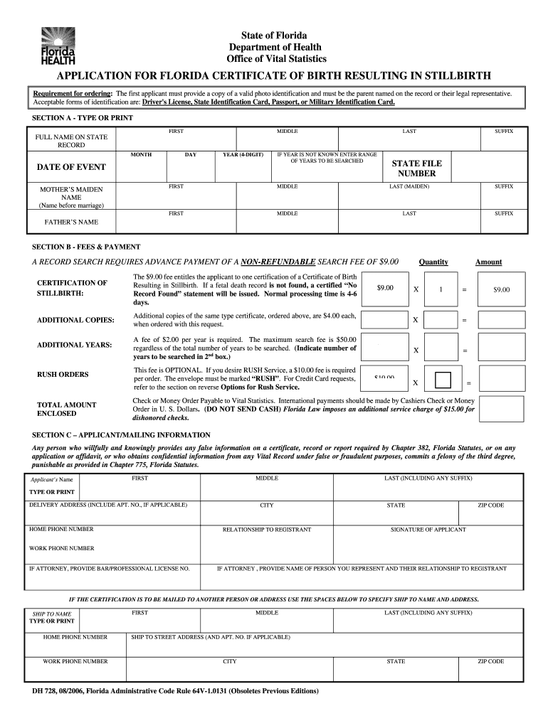 State of Florida Department of Health Office of Vital Statistics APPLICATION FOR FLORIDA CERTIFICATE OF BIRTH RESULTING IN STILLBIRTH Requirement for ordering: The first applicant must provide a copy
