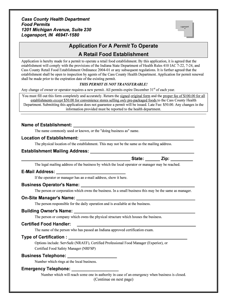 Class County Health Department Food Permits 1201 Michigan Avenue, Suite 230 Logan sport, IN 469471580 Application For A Permit To Operate A Retail Food Establishment Application is hereby made for