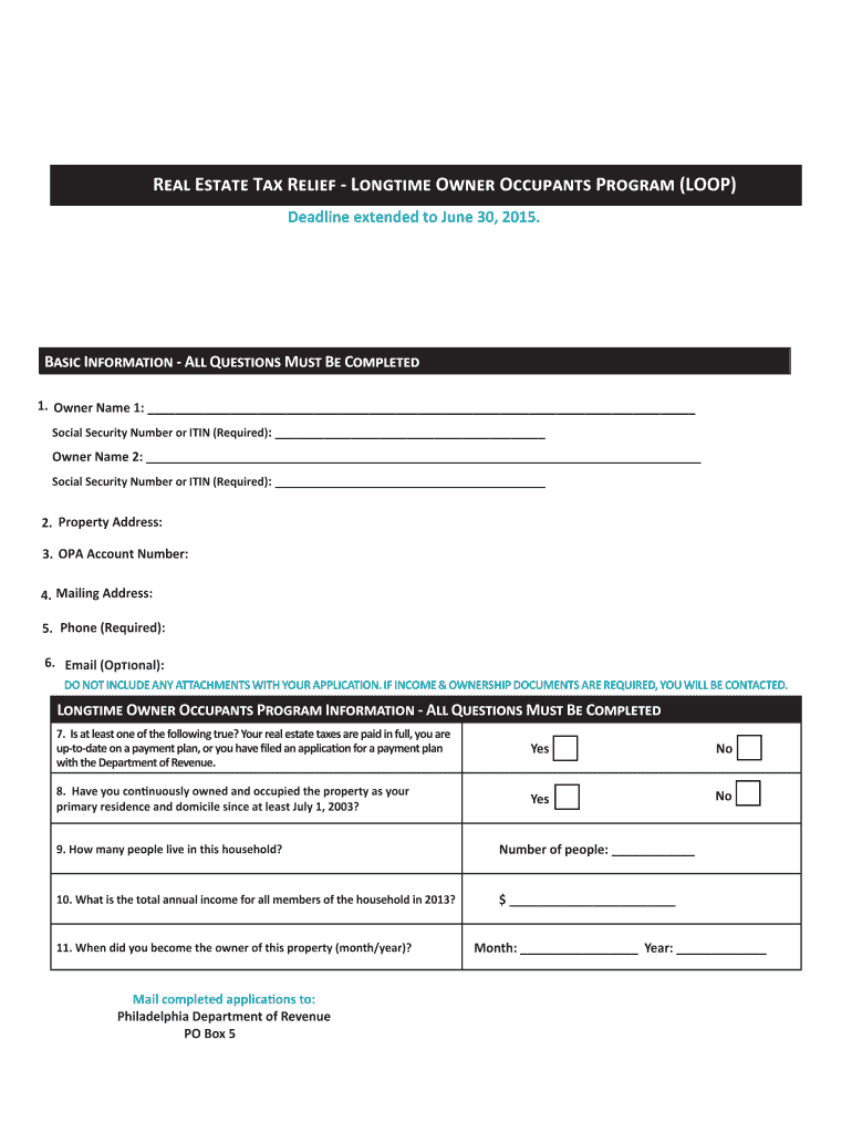Real Estate Tax Relief Longtime Owner Occupants Program (LOOP) Deadline extended to June 30, 2015. By signing this application I am asserting that I am the owner of the property listed below. Any