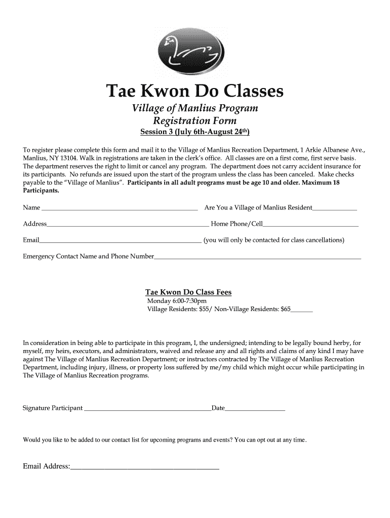 Participants in tae kwon do classes may need to provide personal information, health history, and emergency contact information.