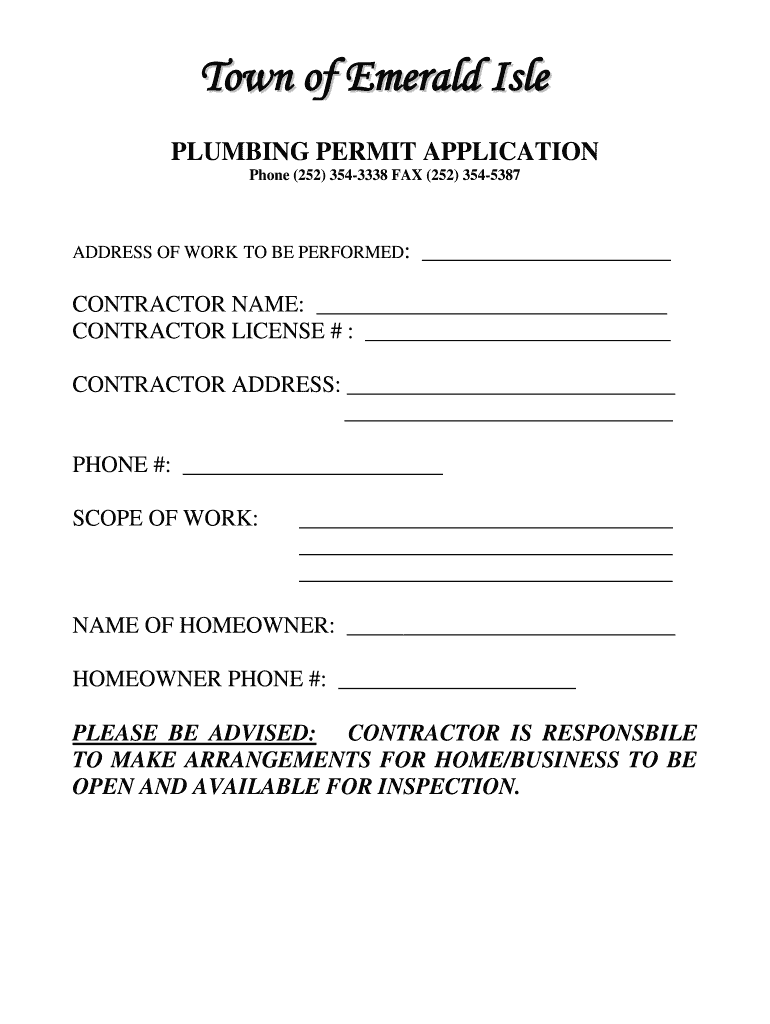 Town of Emerald Isle PLUMBING PERMIT APPLICATION Phone (252) 3543338 FAX (252) 3545387 ADDRESS OF WORK TO BE PERFORMED: CONTRACTOR NAME: CONTRACTOR LICENSE # : CONTRACTOR ADDRESS: PHONE #: SCOPE OF