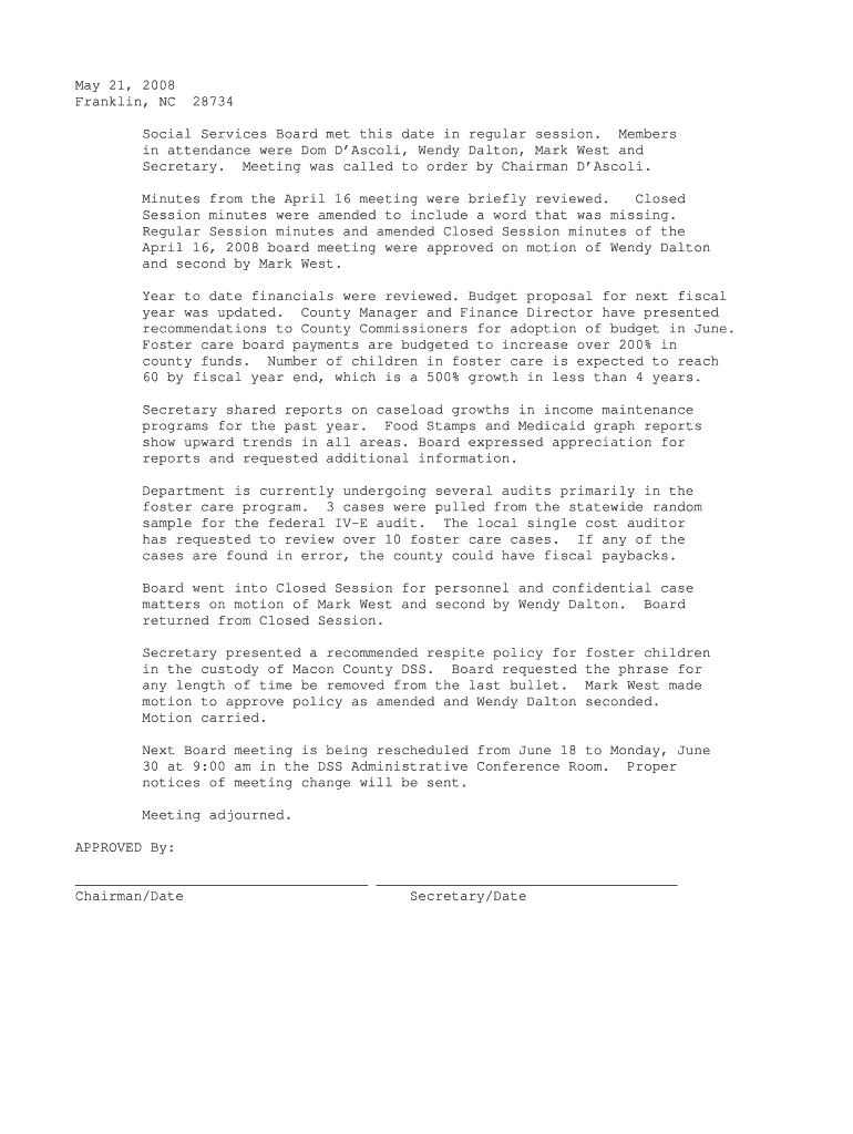 May 21, 2008, Franklin, NC 28734 Social Services Board met this date in regular session. Members in attendance were DOM Mascot, Wendy Dalton, Mark West and Secretary. Meeting was called to order by