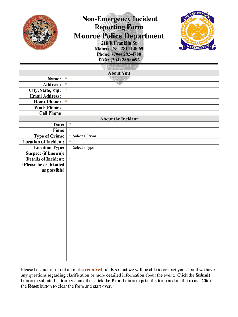 Emergency Incident Reporting Form Monroe Police Department 218 E Franklin St Monroe, NC 281110069 Phone: (704) 2824700 FAX: (704) 2830692 About You Name: Address: City, State, Zip: Email Address: