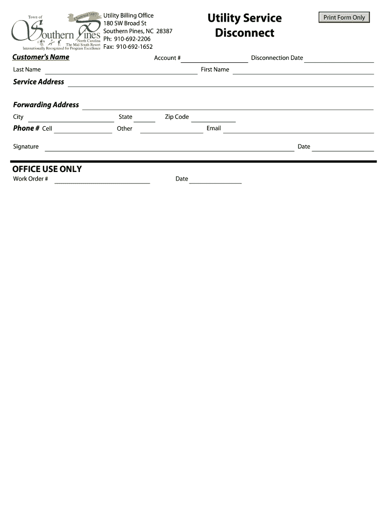 Utility Service Disconnect Utility Billing Office 180 SW Broad St Southern Pines, NC 28387 pH: 9106922206 Fax: 9106921652 Customers Name Disconnection Date Account # Last Name Print Form Only First