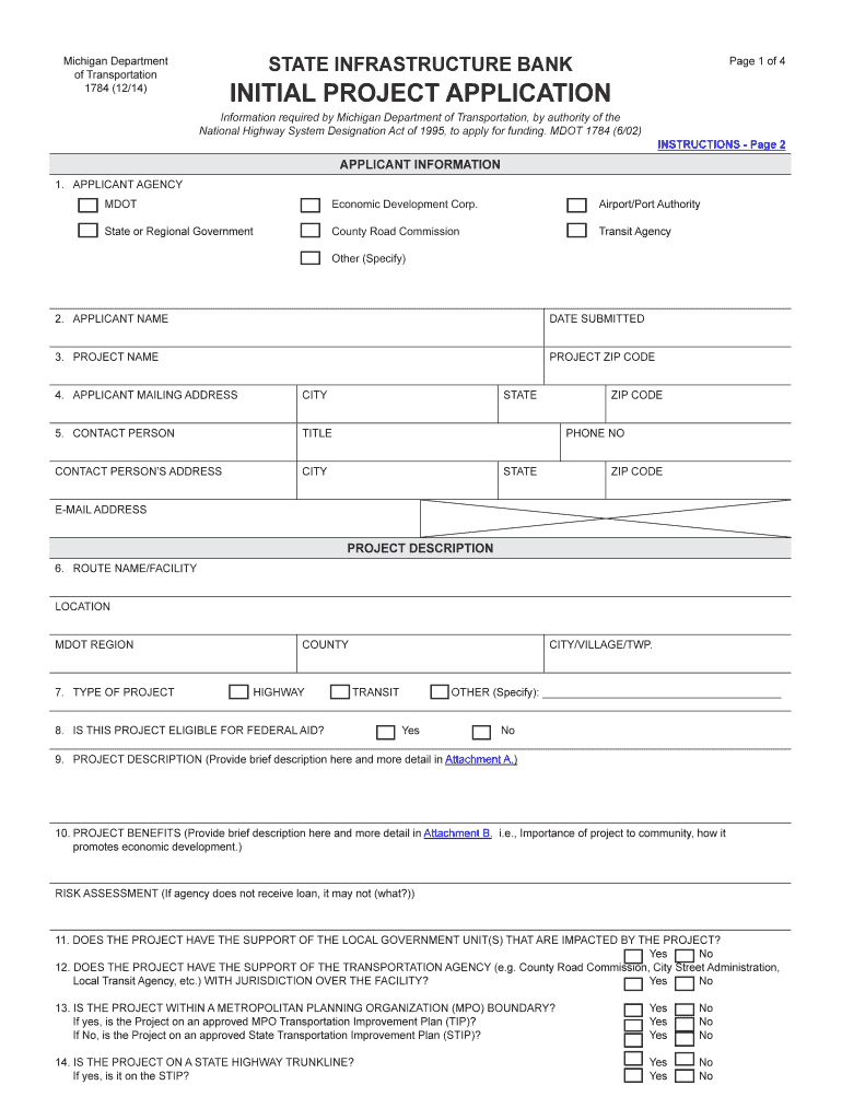 Clear Form STATE INFRASTRUCTURE BANK Michigan Department of Transportation 1784 (12/14) Page 1 of 4 INITIAL PROJECT APPLICATION Information required by Michigan Department of Transportation, by authority