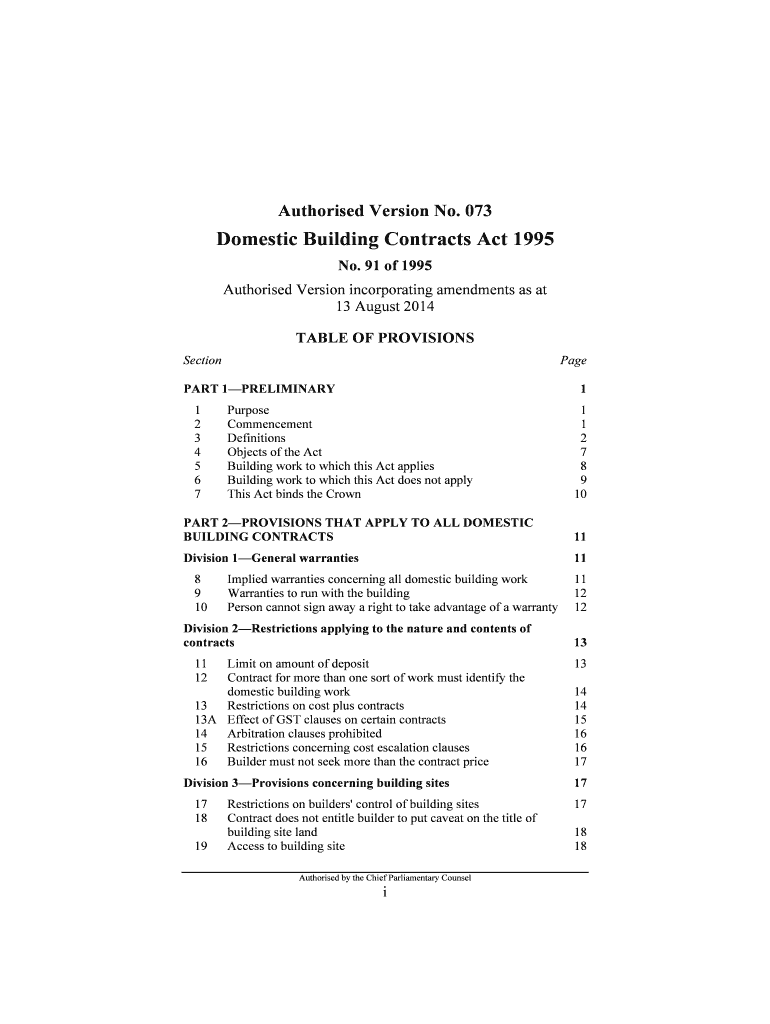 Authorized Version No. 073 Domestic Building Contracts Act 1995 No. 91 of 1995 Authorized Version incorporating amendments as at 13 August 2014 TABLE OF PROVISIONS Section Page PART 1PRELIMINARY 1