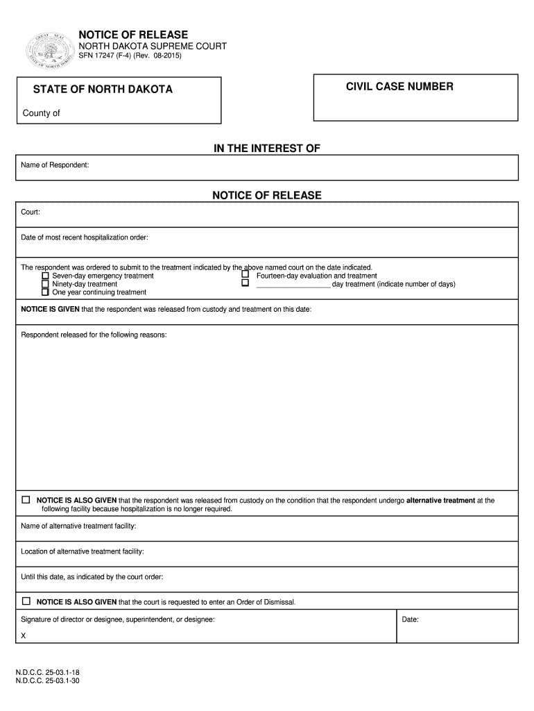 NOTICE OF RELEASE NORTH DAKOTA SUPREME COURT SON 17247 (F4) (Rev. 082015) CIVIL CASE NUMBER STATE OF North Dakota County of IN THE INTEREST OF Name of Respondent: NOTICE OF RELEASE Court: Date of