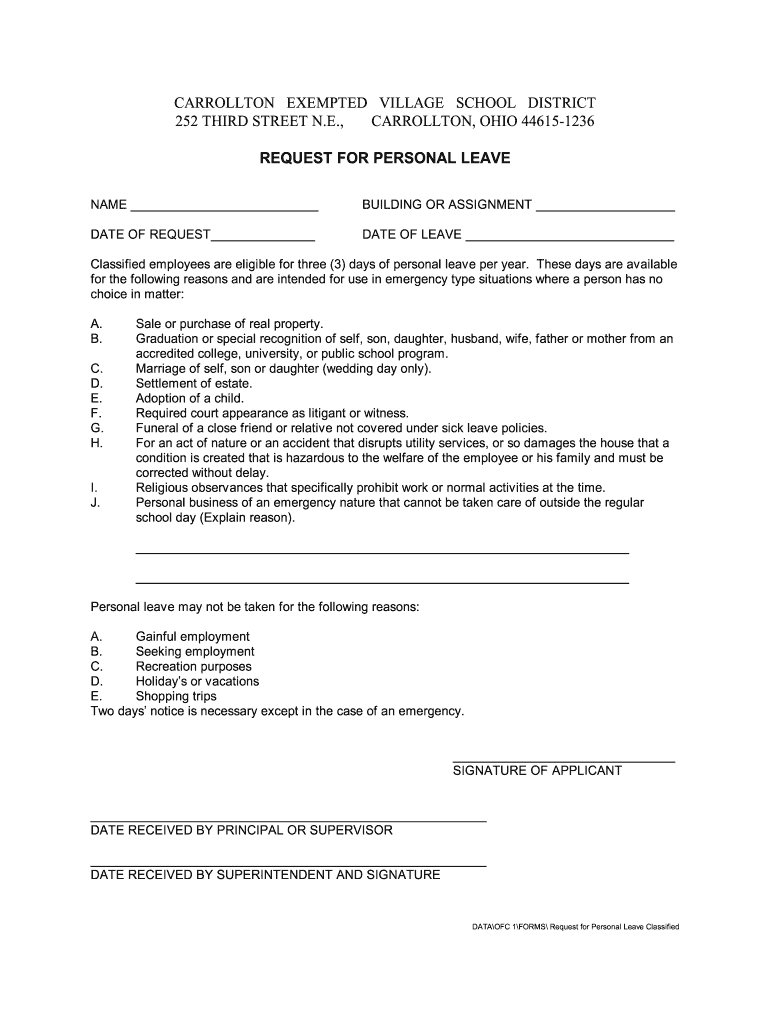CARROLLTON EXEMPTED VILLAGE SCHOOL DISTRICT 252 THIRD STREET N.E., CARROLLTON, OHIO 446151236 REQUEST FOR PERSONAL LEAVE NAME BUILDING OR ASSIGNMENT DATE OF REQUEST DATE OF LEAVE Classified employees