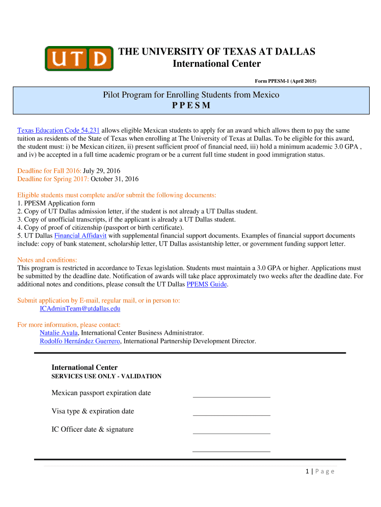 THE UNIVERSITY OF TEXAS AT DALLAS International Center Form PPESM1 (April 2015) Pilot Program for Enrolling Students from Mexico PP ESM Texas Education Code 54.231 allows eligible Mexican students