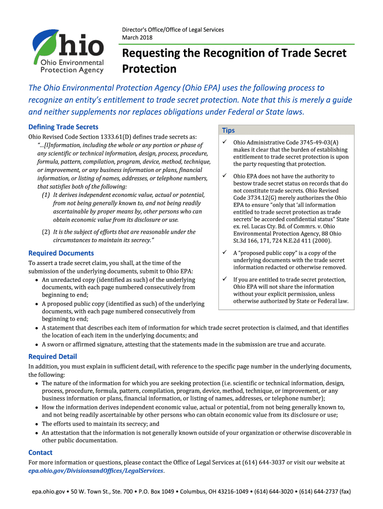 Director's Office/Office of Legal Services March 2018Requesting the Recognition of Trade Secret Protection The Ohio Environmental Protection Agency (Ohio EPA) uses the following process to recognize