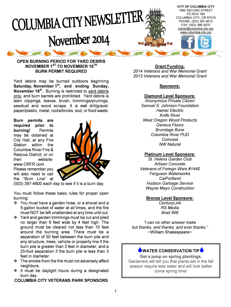 CITY OF COLUMBIA CITY 1840 SECOND STREET PO BOX 189 COLUMBIA CITY, OR 97018 PHONE: (503) 3974010 FAX: (503) 3662870 col city columbiacity.org www.columbiacity.org OPEN BURNING PERIOD FOR YARD DEBRIS