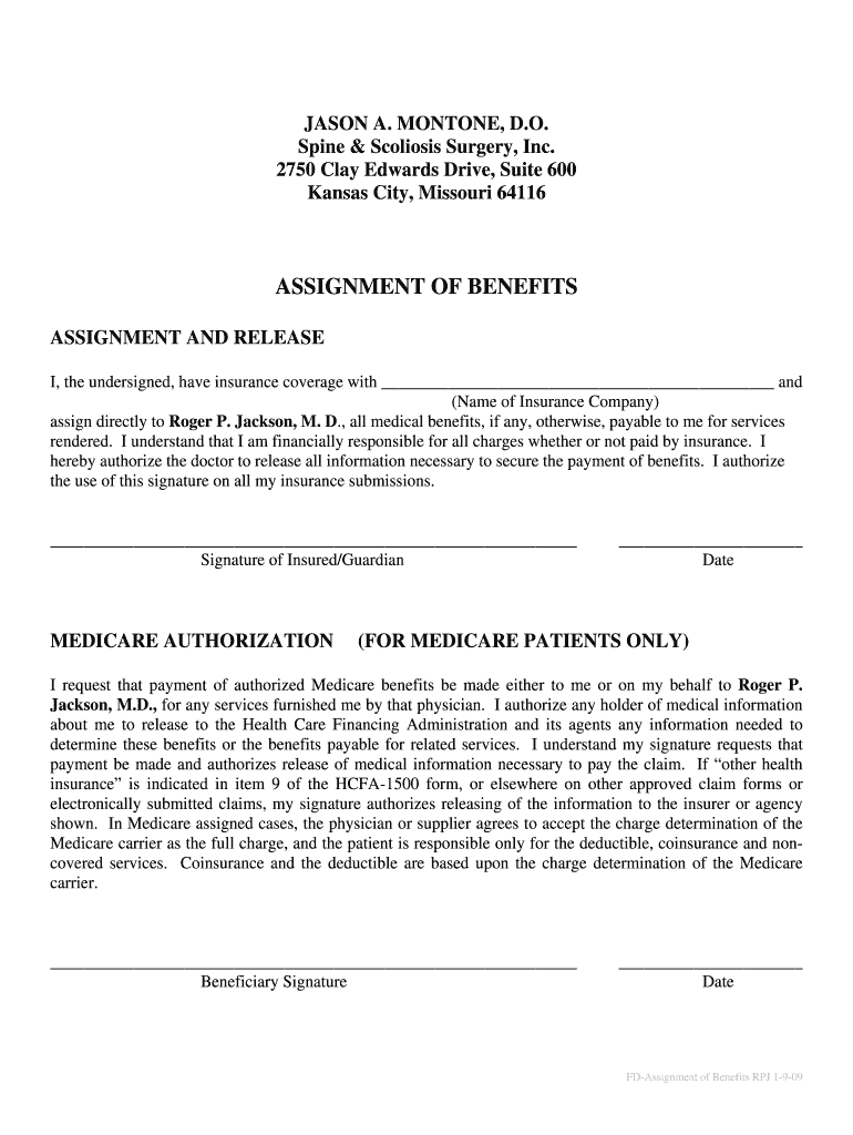 JASON A. MONOTONE, D.O. Spine & Scoliosis Surgery, Inc. 2750 Clay Edwards Drive, Suite 600 Kansas City, Missouri 64116 ASSIGNMENT OF BENEFITS ASSIGNMENT AND RELEASE I, the undersigned, have insurance
