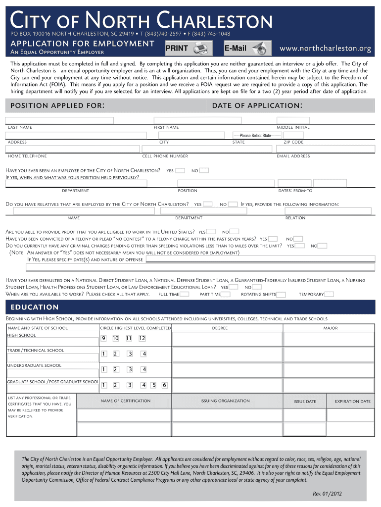 PO BOX 190016 NORTH CHARLESTON, SC 29419 T (843)740-2597 F (843) 745-1048 application for employment E-Mail PRINT An Equal Opportunity Employer www.northcharleston.org This application must be completed