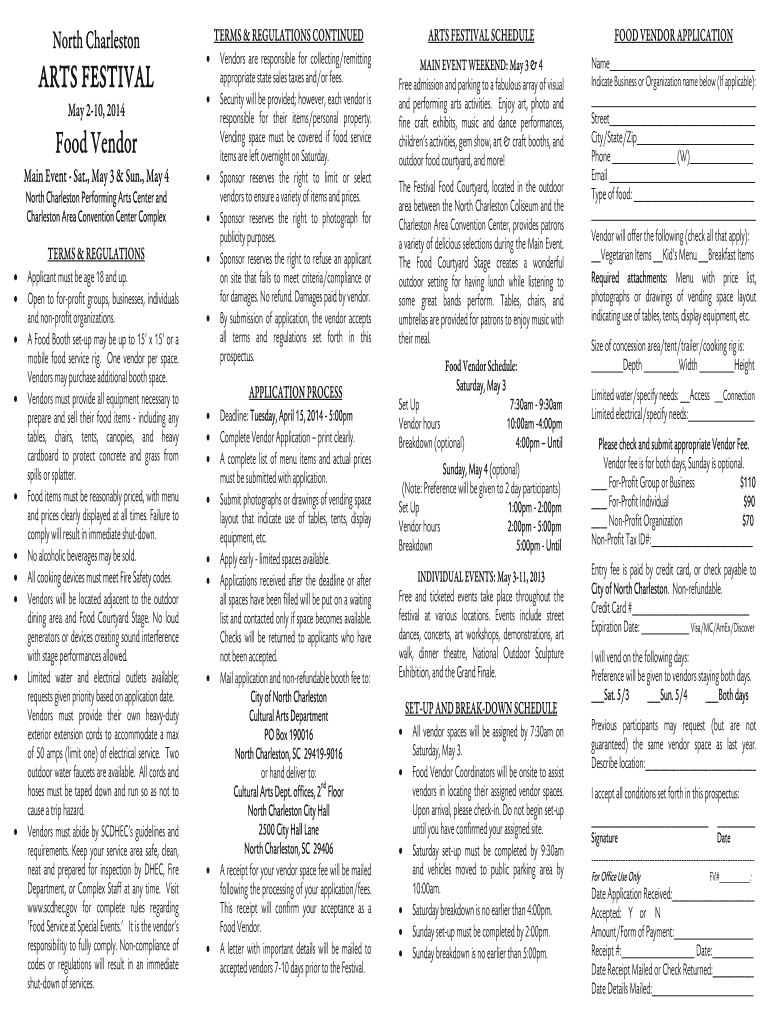 North Charleston ARTS FESTIVAL May 210, 2014 TERMS & REGULATIONS CONTINUED Food Vendor Main Event Sat., May 3 & Sun., May 4 TERMS & REGULATIONS North Charleston Performing Arts Center and Charleston