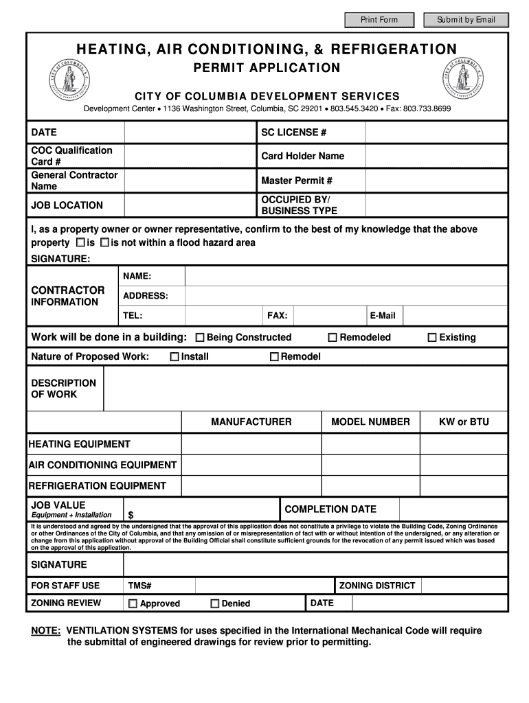 Print Form Submit by Email HEATING, AIR CONDITIONING, & REFRIGERATION PERMIT APPLICATION CITY OF COLUMBIA DEVELOPMENT SERVICES Development Center 1136 Washington Street, Columbia, SC 29201 803.545.3420