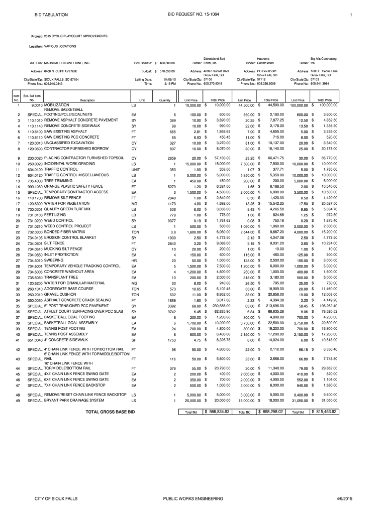 BID REQUEST NO. 151064 BID TABULATION 1 Project: 2015 CYCLIC LAYOUT IMPROVEMENTS Location: VARIOUS LOCATIONS A/E Firm: MARSHALL ENGINEERING, INC. Bid Estimate: $460,800.00 Budget: $516,050.00 Address: