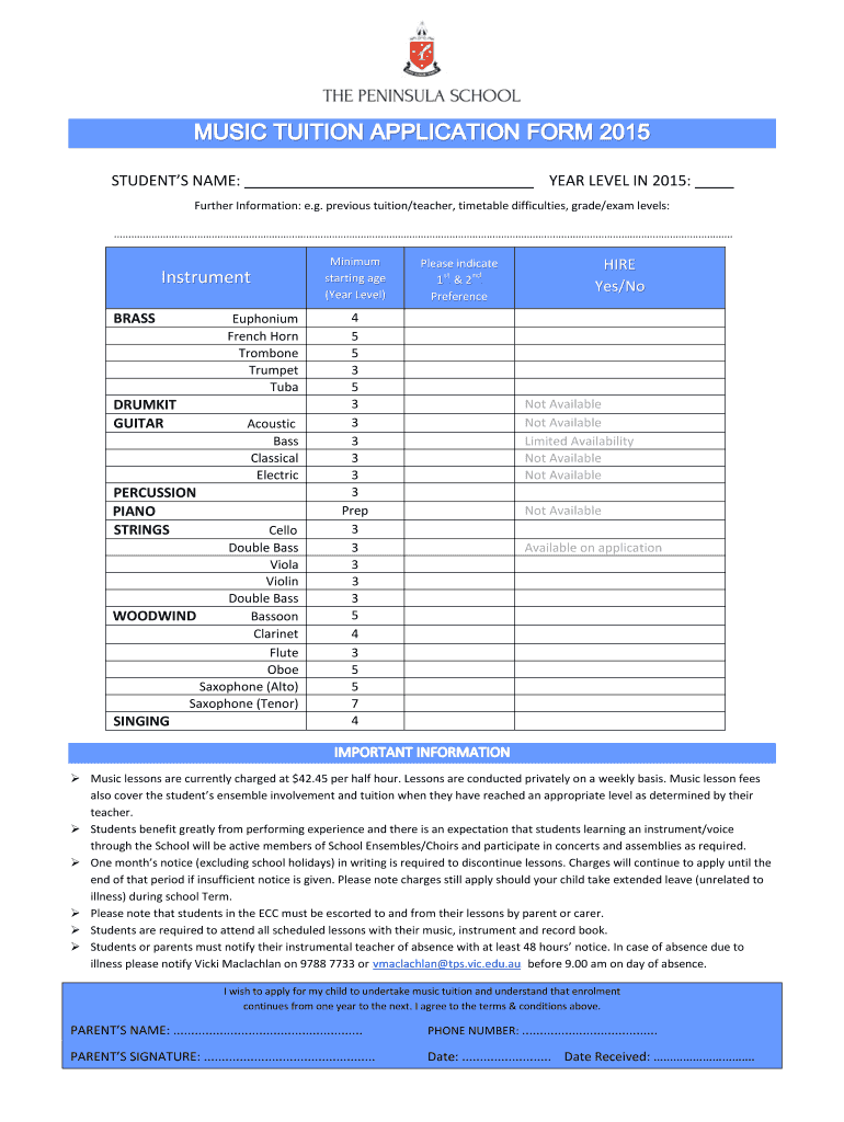 STUDENTS NAME: YEAR LEVEL IN 2015: Further Information: e.g. previous tuition/teacher, timetable difficulties, grade/exam levels: ........................................................................................................................................................................................................................