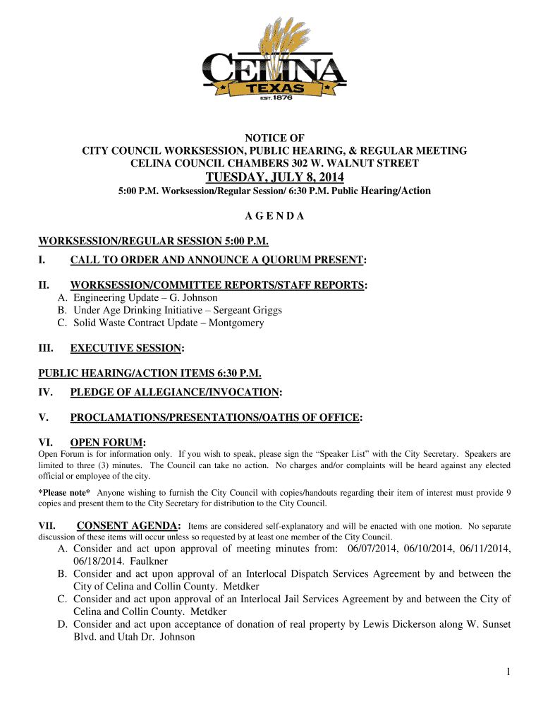 NOTICE OF CITY COUNCIL POSSESSION, PUBLIC HEARING, & REGULAR MEETING CELINA COUNCIL CHAMBERS 302 W. WALNUT STREET TUESDAY, JULY 8, 2014 5:00 P.M. Work session/Regular Session/ 6:30 P.M. Public Hearing/Action