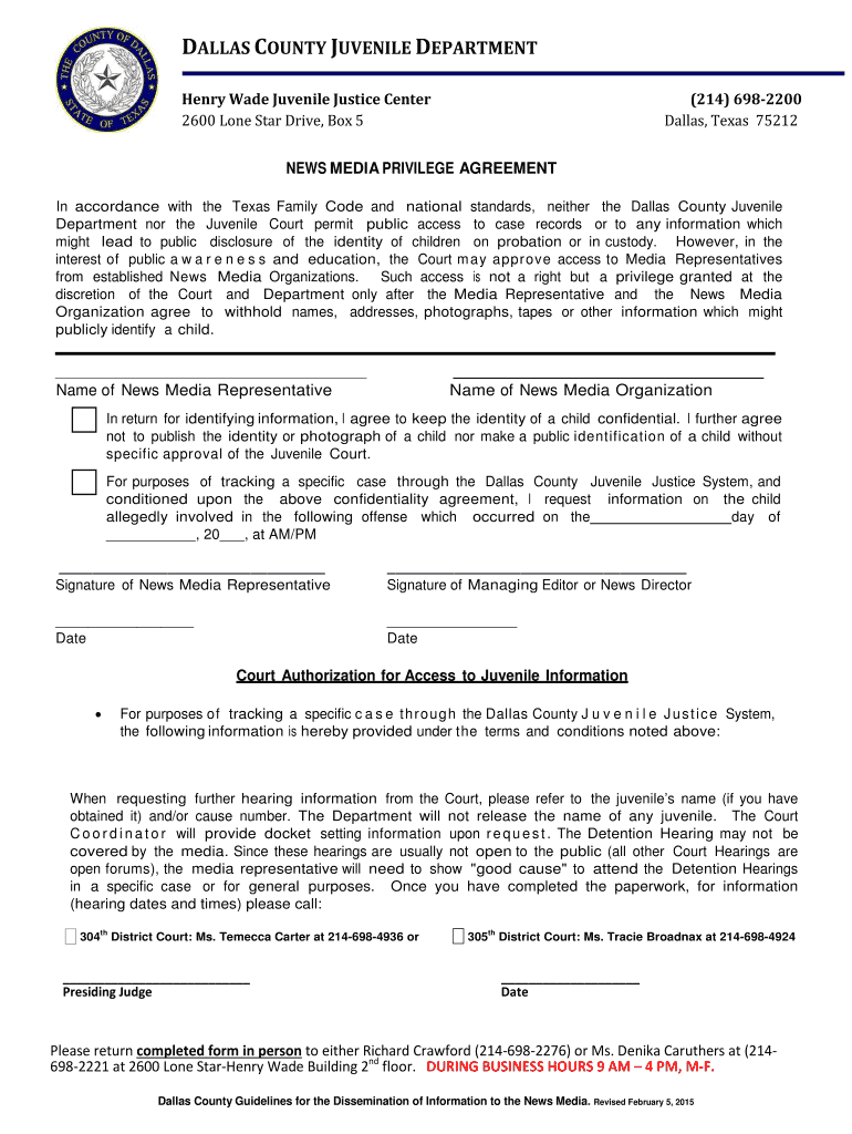 DALLAS COUNTY JUVENILE DEPARTMENT Henry Wade Juvenile Justice Center 2600 Lone Star Drive, Box 5 (214) 6982200 Dallas, Texas 75212 DALLAS COUNTY GUIDELINES FOR THE DISSEMINATION OF INFORMATION TO