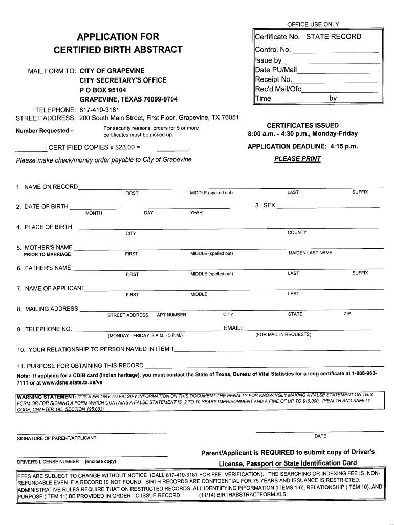 The Texas Birth Certificate Application is a government form used by individuals to request certified copies of a birth record from Grapevine, Texas.