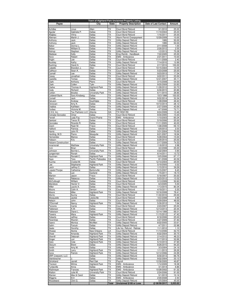 Get the free Town of Highland Park Unclaimed Property Listing
