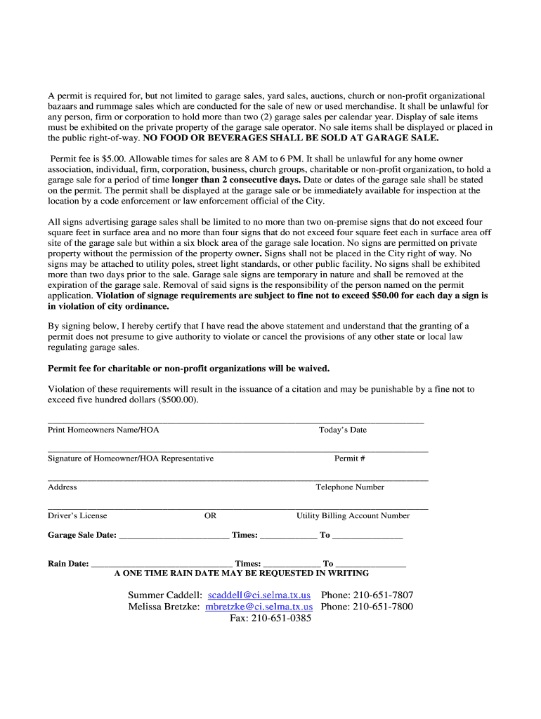 A permit is required for, but not limited to garage sales, yard sales, auctions, church or nonprofit organizational