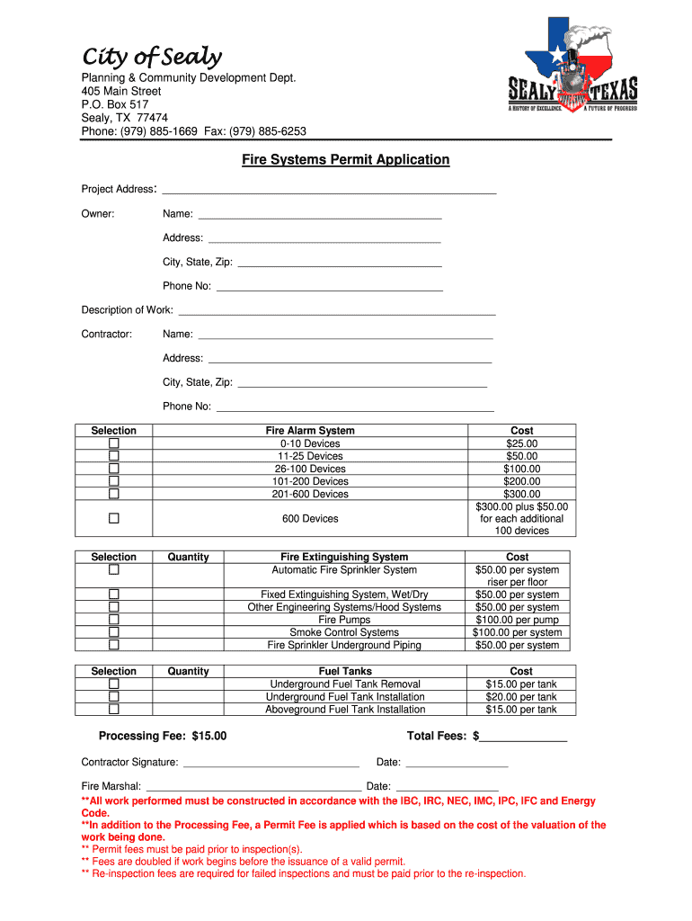 City of Seal Planning & Community Development Dept. 405 Main Street P.O. Box 517 Seal, TX 77474 Phone: (979) 8851669 Fax: (979) 8856253 Fire Systems Permit Application Project Address: Owner: Name: