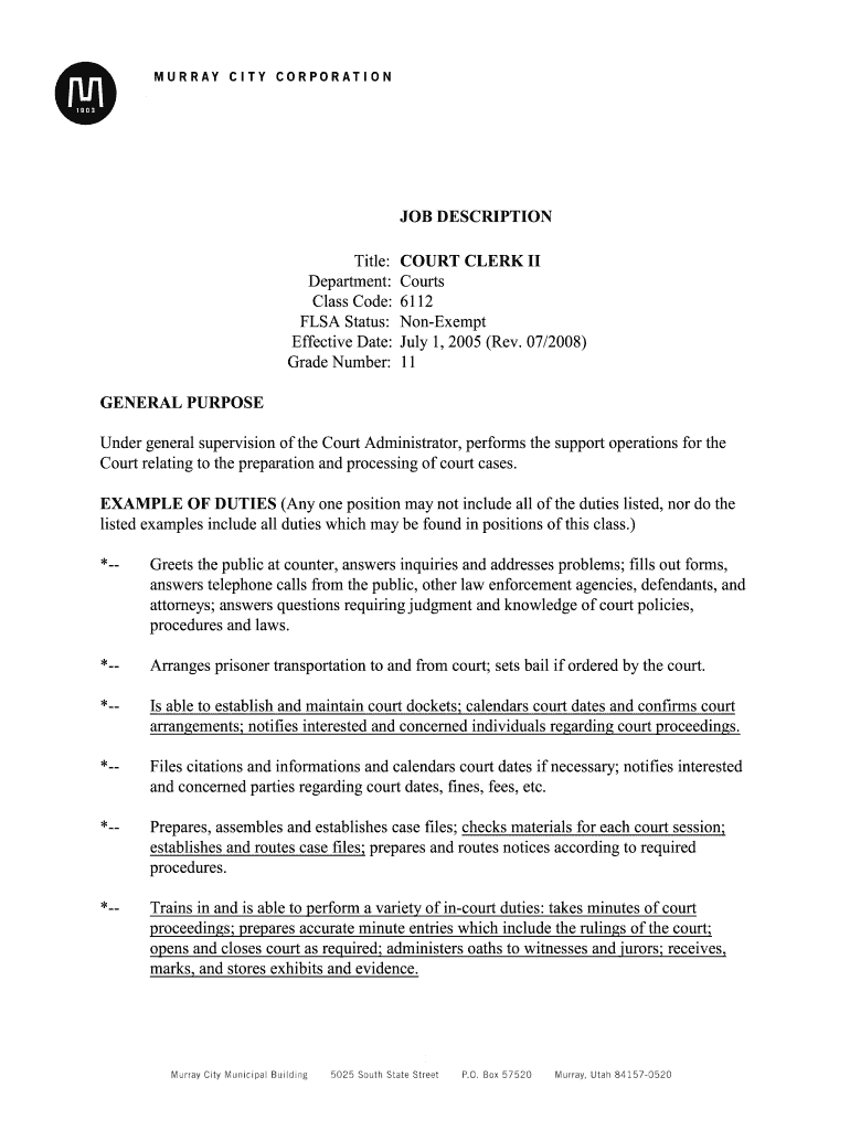 Get the free JOB DESCRIPTION COURT CLERK II - Murray Utah - murray utah