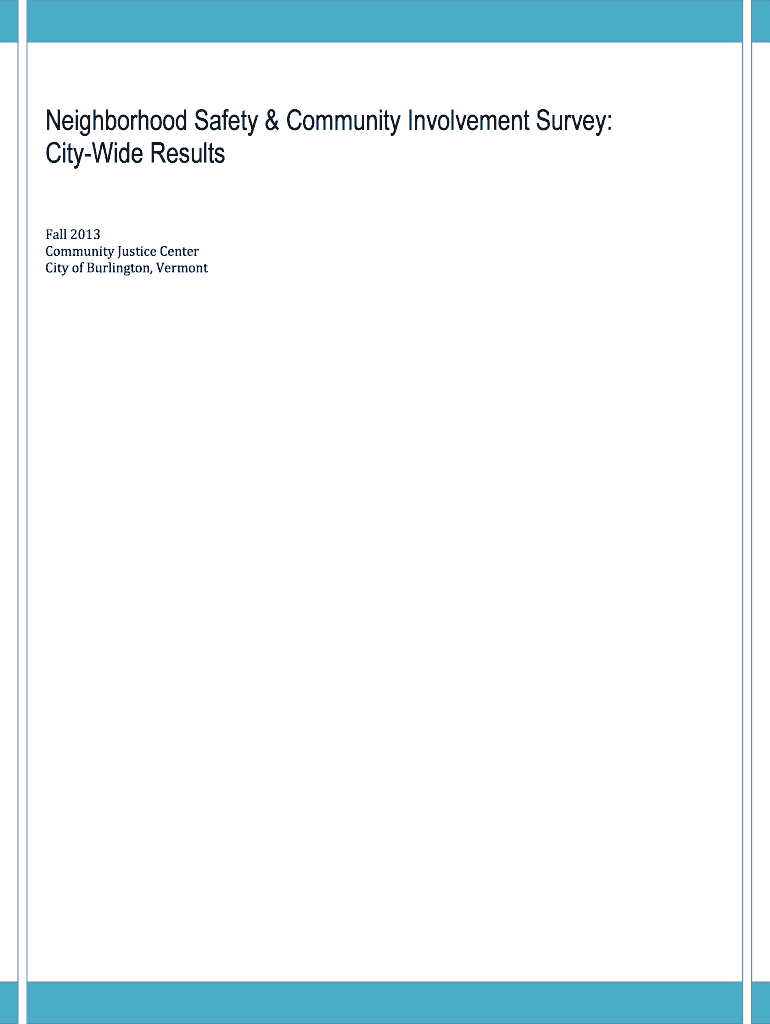 Neighborhood Safety & Community Involvement Survey: Citywide Results Fall 2013 Community Justice Center City of Burlington, VermontNeighborhood Safety & Community Involvement Survey: Citywide Results