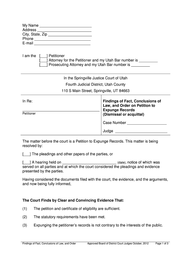 My Name Address City, State, Zip Phone Email I am the Petitioner Attorney for the Petitioner and my Utah Bar number is Prosecuting Attorney and my Utah Bar number is In the Springville Justice Court