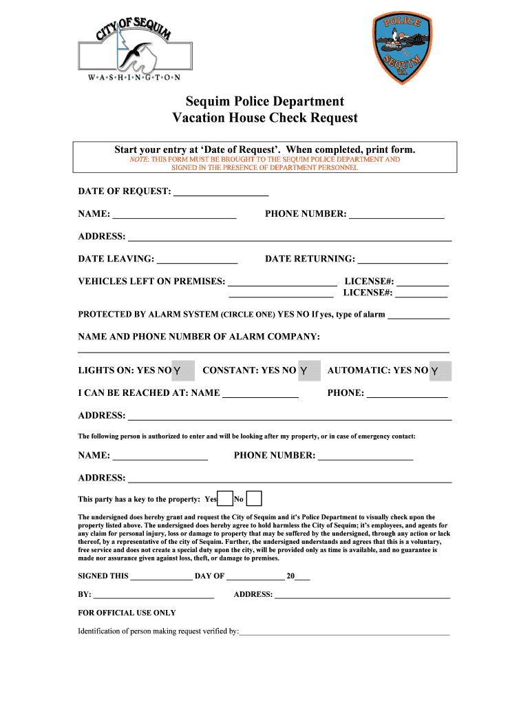 Sequin Police Department Vacation House Check Request Start your entry at Date of Request. When completed, print form. NOTE: THIS FORM MUST BE BROUGHT TO THE SEQUIN POLICE DEPARTMENT AND SIGNED IN