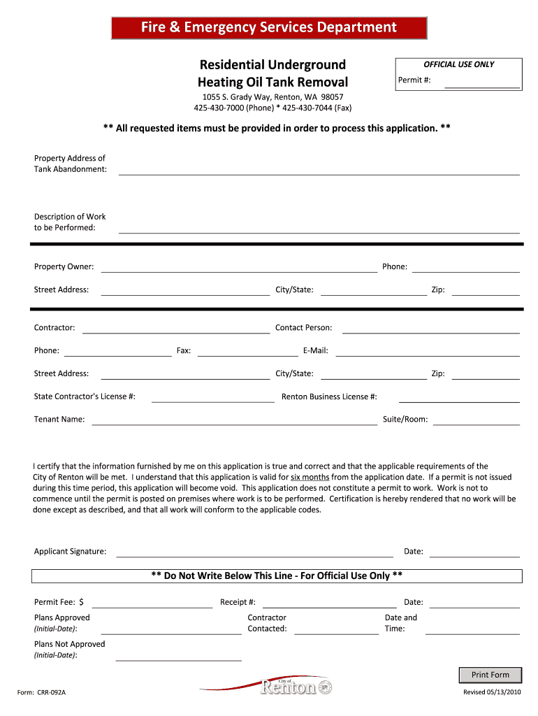 Fire & Emergency Services Department Residential Underground Heating Oil Tank Removal OFFICIAL USE ONLY Permit #: 1055 S. Grady Way, Renton, WA 98057 4254307000 (Phone) * 4254307044 (Fax) ** All requested