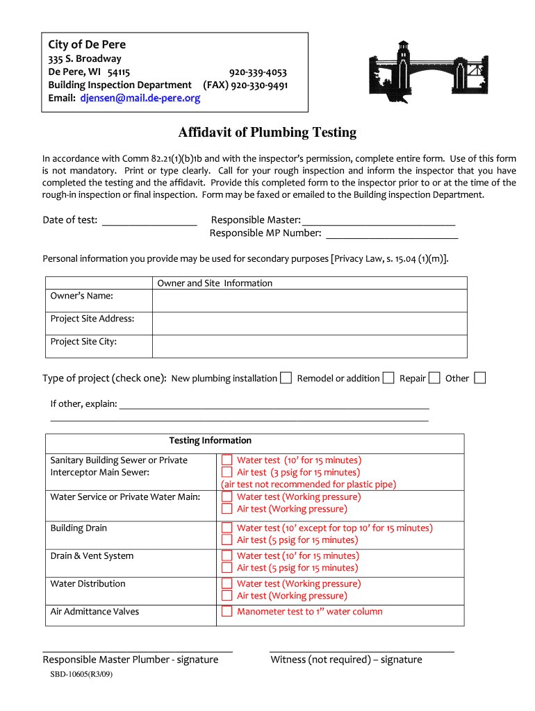 City of De Père 335 S. Broadway De Père, WI 54115 9203394053 Building Inspection Department (FAX) 9203309491 Email: Jensen mail.repair.org Affidavit of Plumbing Testing In accordance with Comm 82.21(1)(b)1b