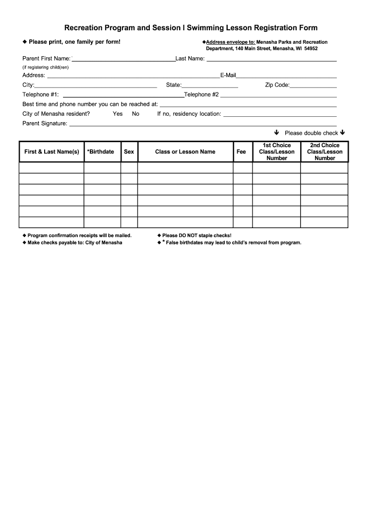 Get the free Recreation Program and Session I Swimming Lesson - cityofmenasha-wi
