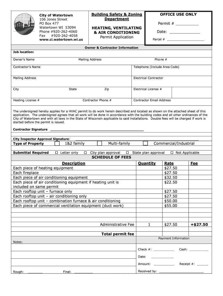 Building Safety & Zoning Department City of Watertown 106 Jones Street PO Box 477 Watertown WI 53094 Phone #9202624060 Fax #9202624058 OFFICE USE ONLY Permit # HEATING, VENTILATING & AIR CONDITIONING