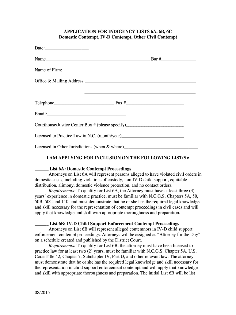 Get the free APPLICATION FOR INDIGENCY LISTS 6A 6B 6C Domestic - nccourts