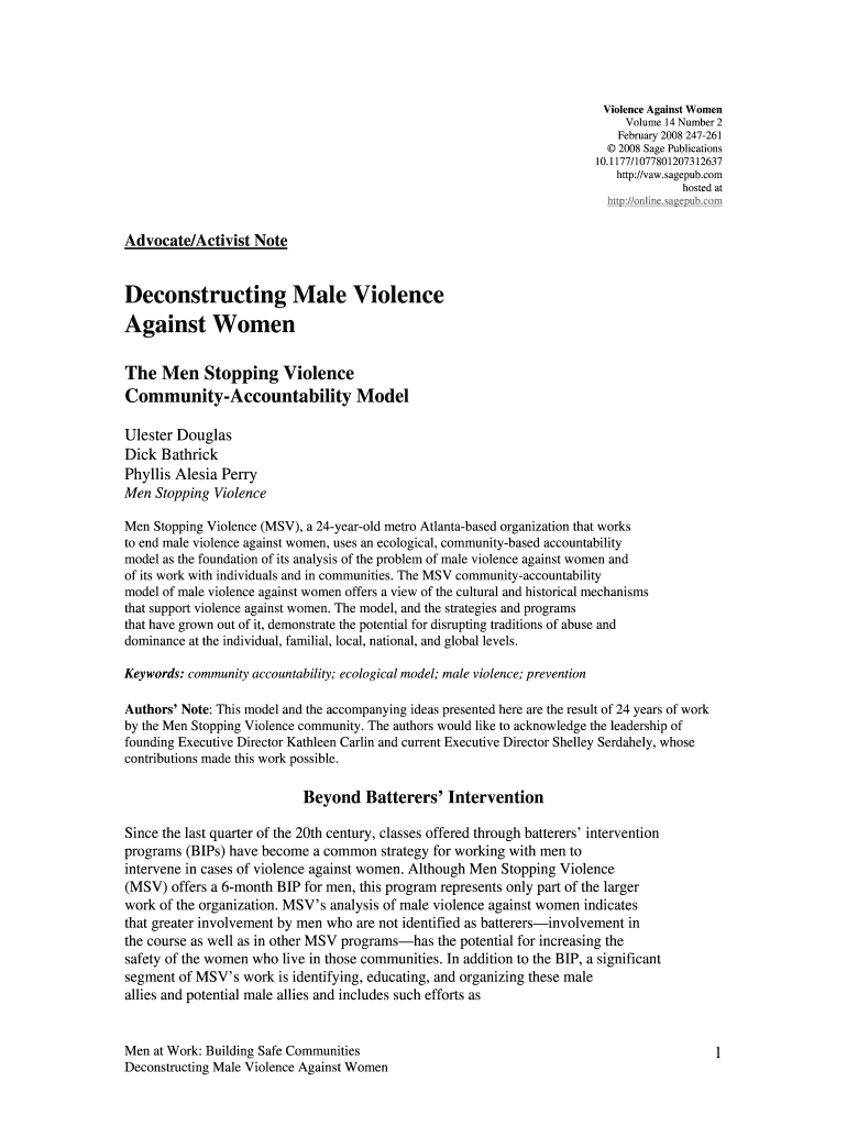 Violence Against Women Volume 14 Number 2 February 2008 247-261 2008 Sage Publications 10.1177/1077801207312637 http://vaw.sagepub.com hosted at http://online.sagepub.com Advocate/Activist Note Deconstructing
