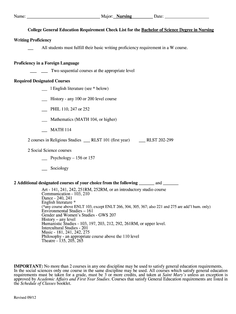 Name: Major: Nursing Date: College General Education Requirement Check List for the Bachelor of Science Degree in Nursing Writing Proficiency All students must fulfill their basic writing proficiency