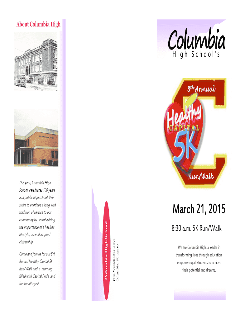 Columbia About Columbia High School s 8:30 a.m. 5K Run/Walk 1701 Westchester Drive Columbia, SC 29210 Come and join us for our 8th Annual Healthy Capital 5k Run/Walk and a morning filled with Capital