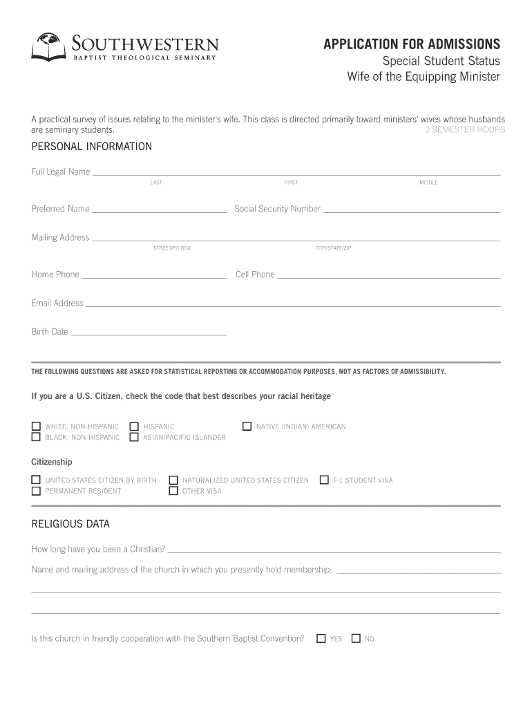 Application for Admissions Special Student Status Wife of the Equipping Minister A practical survey of issues relating to the minister's wife. This class is directed primarily toward ministers wives