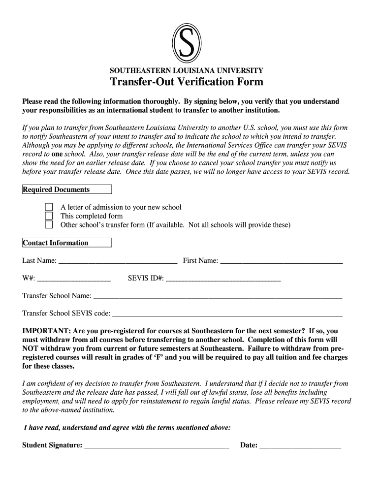 SOUTHEASTERN LOUISIANA UNIVERSITY Transferor Verification Form Please read the following information thoroughly. By signing below, you verify that you understand your responsibilities as an international