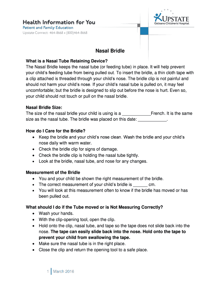 Information such as patient details, medical history, the reason for using the nasal bridle, and any complications or side effects must be reported on nasal bridle - upstateedu.