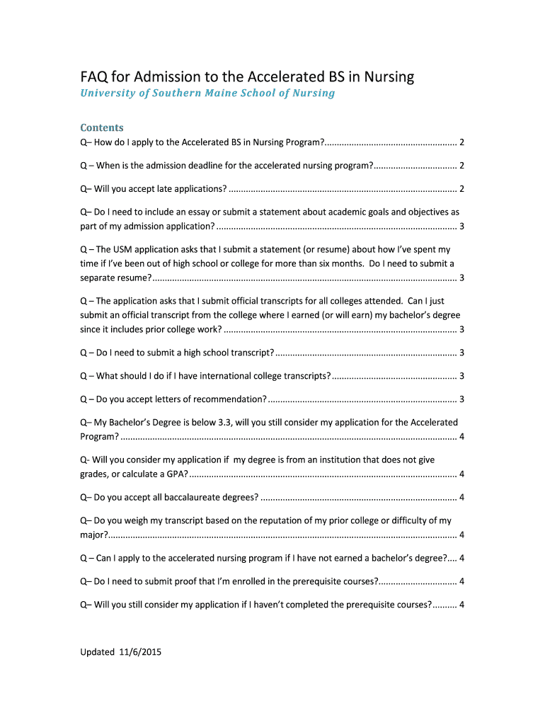 FAQ for Admission to the Accelerated BS in Nursing University of Southern Maine School of Nursing Contents Q How do I apply to the Accelerated BS in Nursing Program?......................................................