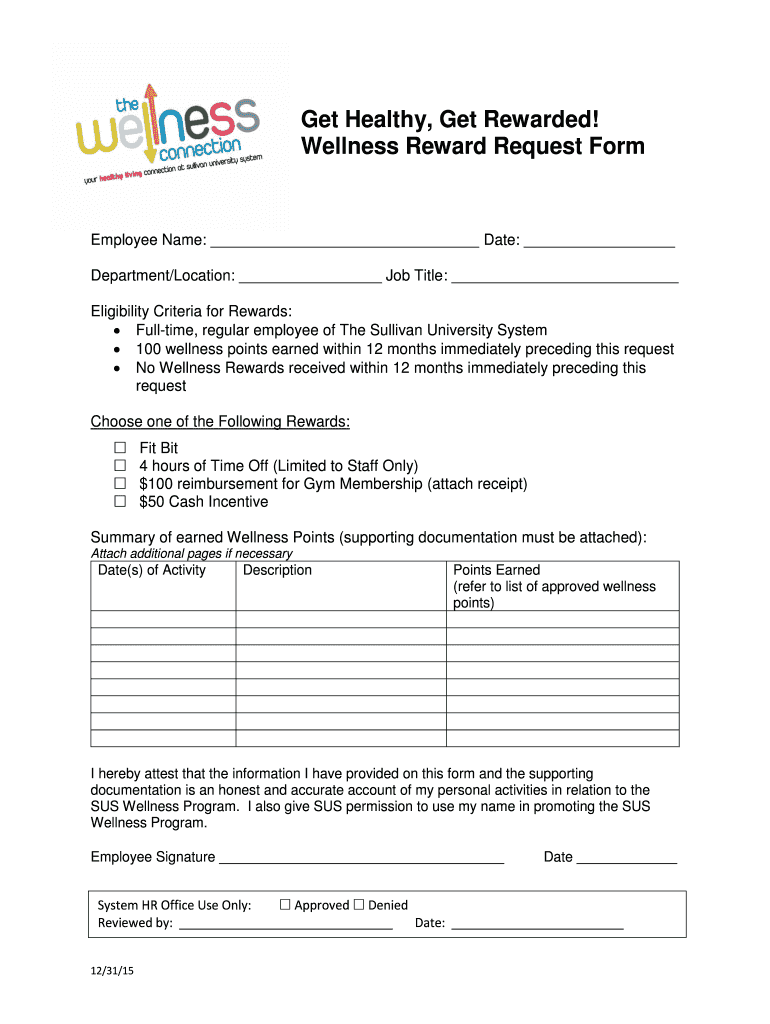 Get Healthy, Get Rewarded! Wellness Reward Request Form Employee Name: Date: Department/Location: Job Title: Eligibility Criteria for Rewards: Full time, regular employee of The Sullivan University