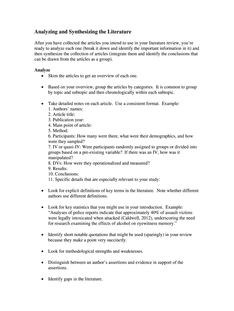 Analyzing and Synthesizing the Literature After you have collected the articles you intend to use in your literature review, you're ready to analyze each one (break it down and identify the important