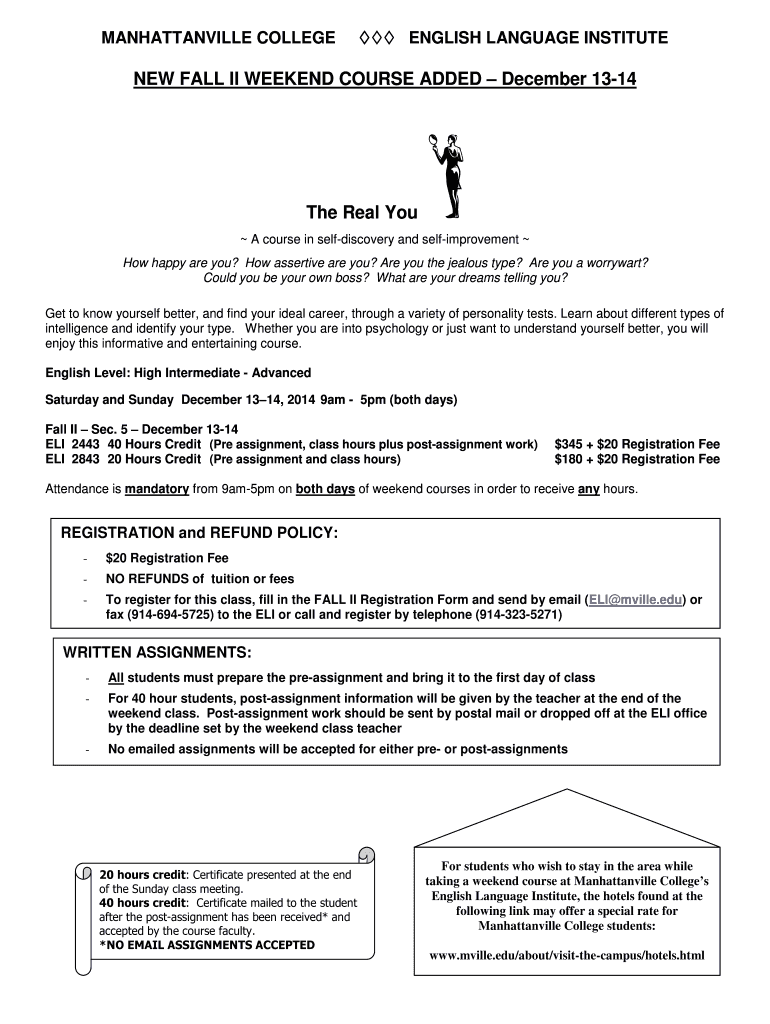MANHATTANVILLE COLLEGE ENGLISH LANGUAGE INSTITUTE NEW FALL II WEEKEND COURSE ADDED December 1314 The Real You A course in self discovery and self-improvement How happy are you? How assertive are you?
